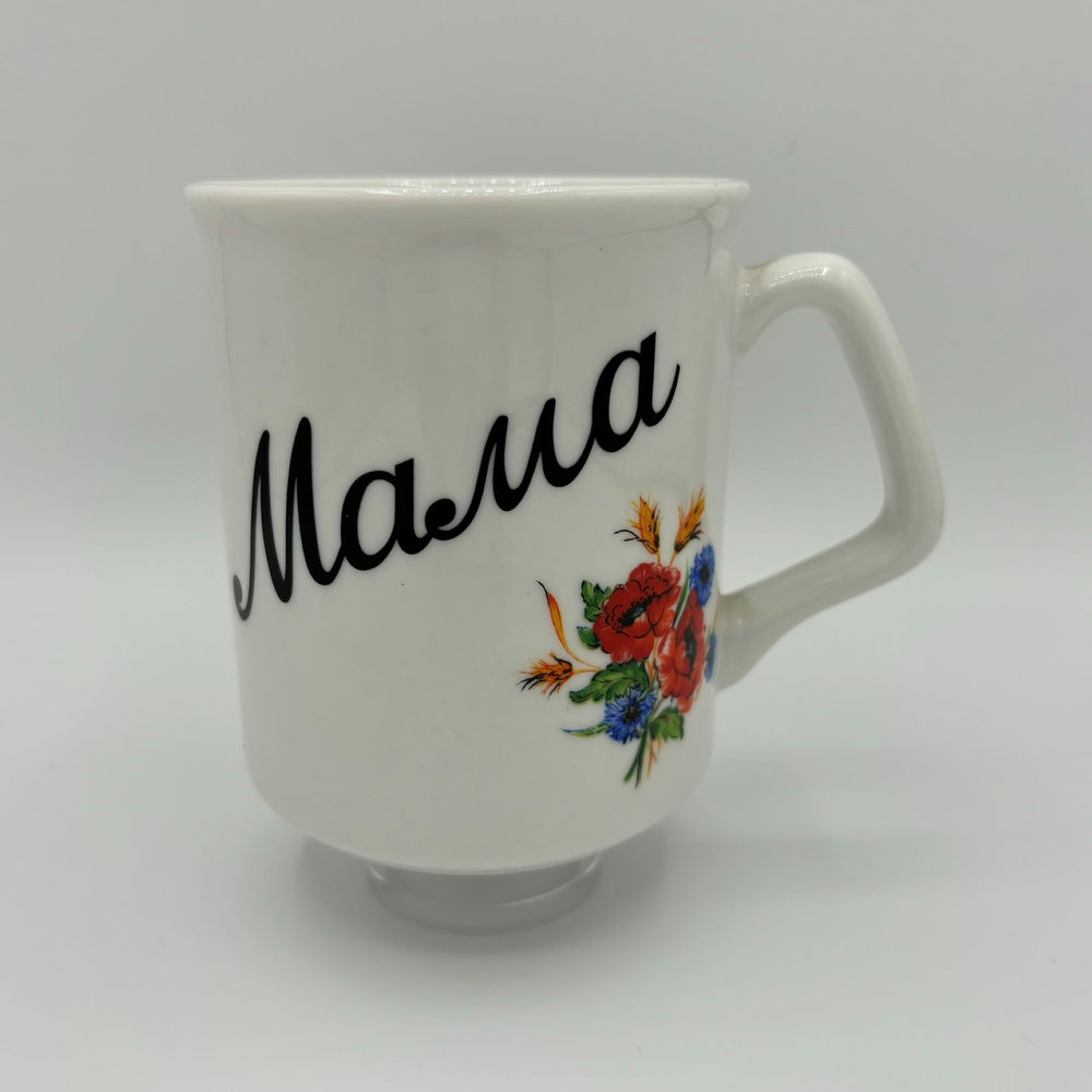 Mama mug with cursive handwriting. Colors are red, white, black and red and white flowers.
