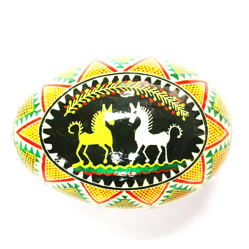 Brightly decorated Goose Egg Shell to warm your home or a friend's heart. There are many flowers and birds representing life, growth and the fulfillment of wishes. Although some goose eggs have similar designs, each egg is unique, highly detailed and created by a skilled Pysanka artist.