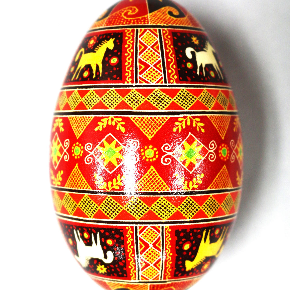 Brightly decorated Goose Egg Shell to warm your home or a friend's heart. There are many flowers and birds representing life, growth and the fulfillment of wishes. Although some goose eggs have similar designs, each egg is unique, highly detailed and created by a skilled Pysanka artist.