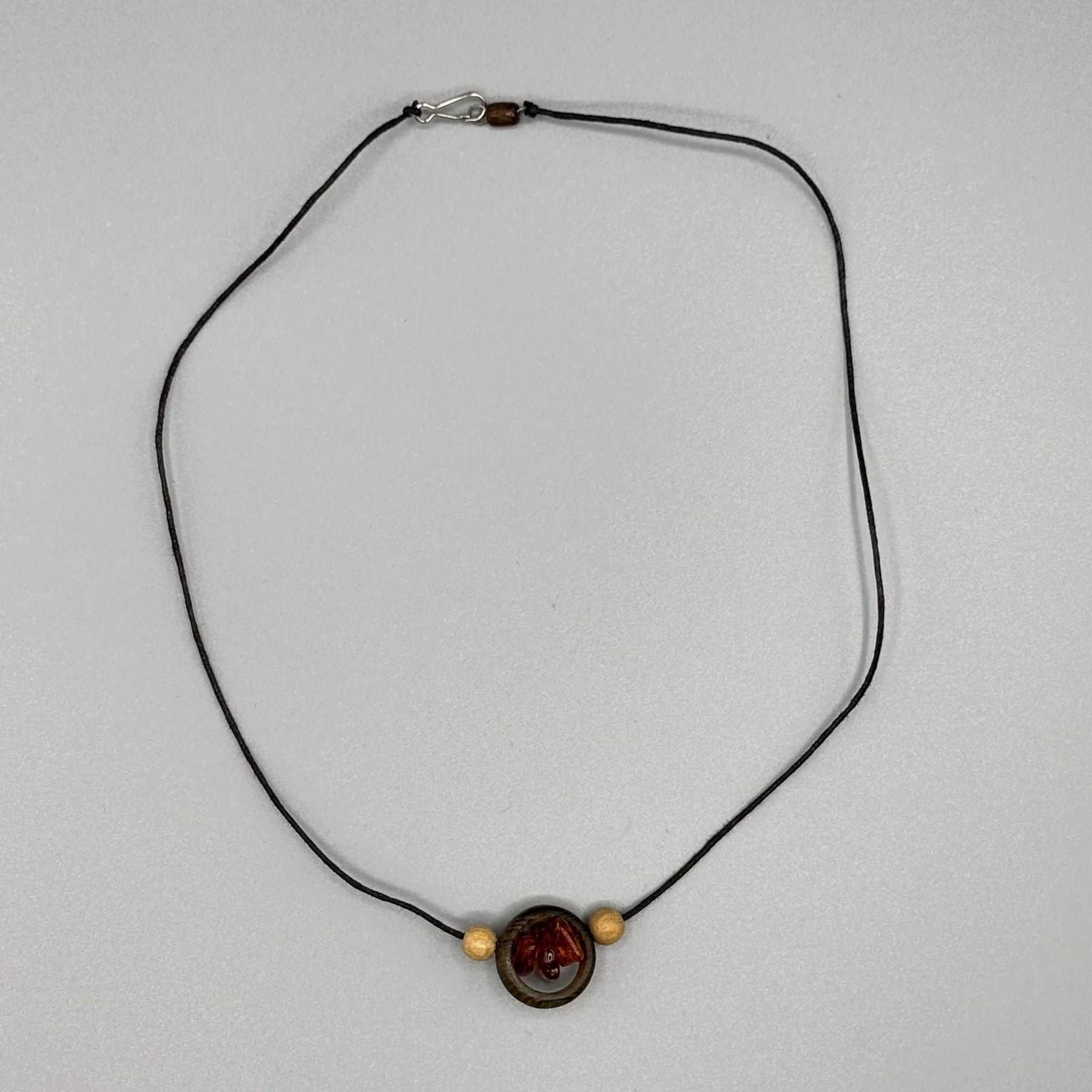 16-inch amber and wood bead string necklace, circle shaped pendant.