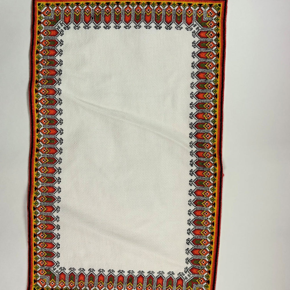 Hand embroidered doily from Ukraine. Colors are primarily orange, black and yellow. The approximate dimensions are 13 by 21 inches.